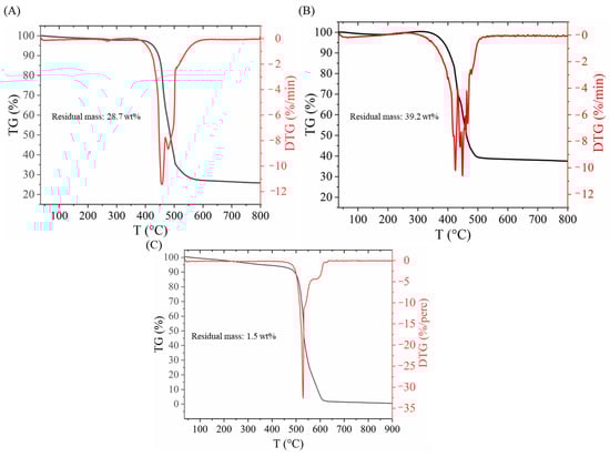 To check the whole metal content as a control, thermogravimetric analysis was also carried out (Figure 2). The residual mass of the support was 28.7 wt%, while in the case of the catalyst, it was 39.2%. It can also be seen that the decomposition of carbon starts earlier in the case of the catalyst, which can be explained with the catalytic effect of the Pd (Figure 2A,B). The shape of the TG curve shows the typical decomposition of a BCNT sample (Figure 2C). The wider decomposition temperature range also indicates the presence of different carbon forms with a different structural order and amount of defects presumably from the decomposition of the sodium alginate.
