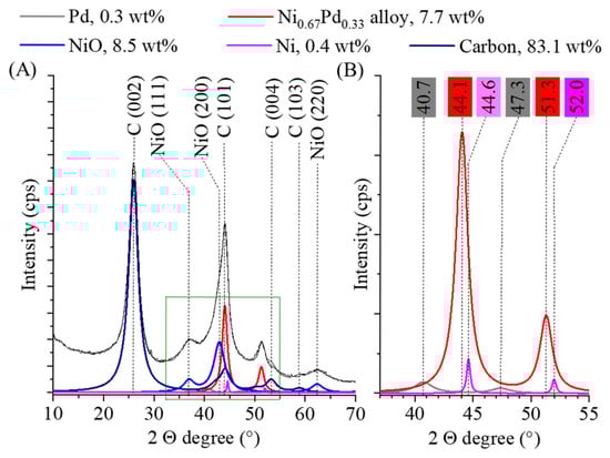 Rietveld refined X-ray diffractogram of the Pd0.33Ni0.67/BCNT catalyst (A) and a magnified section of it with typical reflections of nickel, palladium and the alloy phase (B).