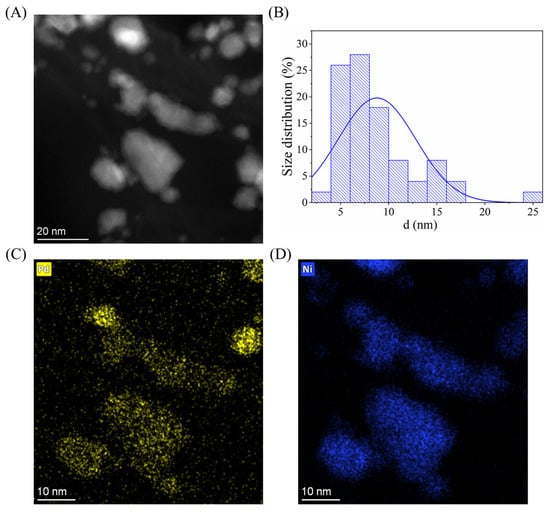 To confirm the alloy phase and determine the particle size and distribution, TEM image (Figure 4A) and element maps were taken (Figure 4C,D). For the size determination, 100 nanoparticles were measured using ImageJ (v1.54p) image analysis software on multiple TEM images. It is visible that the Pd and Ni particles cannot be separated and they form single particles with a bigger size (Figure 4C,D). This fact correlates well with the result of the XRD measurement and the Pd and Ni particles are mainly present in alloy form. Since both elements are present in the visible particles, the measured size distribution shows the size of the particle mixture of Pd, Ni, NiO, and Ni0.67Pd0.33. (Figure 4B). It can be seen that the majority of the particles are smaller than 20 nm, while the average diameter is 9 ± 4 nm. On the TEM image and element maps with lower magnification, it is visible that the particles cover the BCNTs well (Figure S2).