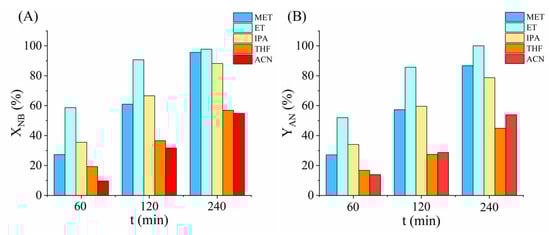 Nitrobenzene conversion (XNB) and aniline yield (YAN) in five different solvents at 60, 120, and 240 min in the three test cycles.