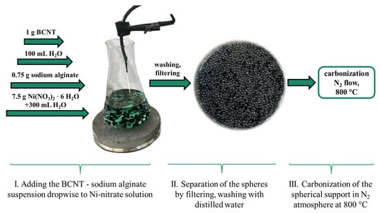 The bamboo-like carbon nanotube (BCNT) synthesis procedure followed the same methodology as described in our previous work []. The preparation of the spherified catalyst supports was based on a method also reported in our previous study []. A mixture of 100 mL deionized water, 0.750 g sodium alginate, and 1.000 g N-BCNT was prepared using a Hielscher homogenizer. This mixture was added dropwise to the solution of 7.500 g Ni(NO3)2 · 6 H2O in 300 mL deionized water (0.1368 molL−1 solution, pH 6.8) using a syringe pump (150 mL/h). After the addition, the solvent was removed by filtering and the spheres were washed with deionized water and dried at 105 °C for 24 h. The prepared beads were calcinated at 800 °C under a nitrogen flow for 60 min (Figure 6). Palladium was adsorbed by the supports by impregnation–reduction. A total of 1.150 g of the catalyst support was added to a 100 mL aqueous solution containing 0.100 g of Pd(NO3)2 2 H2O followed by vacuum evaporation and reduction at 400–on in a H2 stream for 30 min.