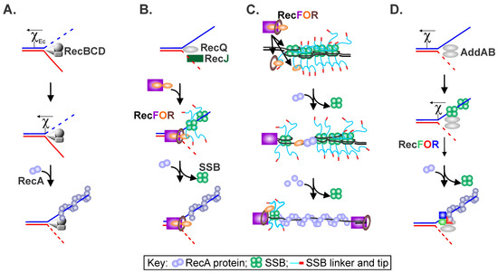 Several years ago, an alternate recombination pathway was identified in E. coli that is different at the initiation stages from the primary pathway (Figure 1B,C). In a recBC sbcBC background, the RecF, O, and R proteins are necessary for recombination initiation in what is now known as the RecF pathway [7,8]. It was later shown that the RecA, RecJ, RecF, RecN, RecO, RecR, and RecQ proteins are required in addition to the ubiquitous SSB (Figure 1B) [9,10,11]. In this pathway, dsDNA end processing is catalyzed by the RecQ helicase, with nucleolytic processing provided by the RecJ nuclease. Together, these proteins produce a 3′-ssDNA-tailed duplex to which SSB binds [12]. Subsequently, the RecFOR proteins mediate the displacement of SSB concomitant with the loading of RecA onto the ssDNA [13,14]. Displacement by RecO involves interactions between the oligonucleotide–oligosaccharide binding fold (OB-fold) of the mediator and the intrinsically disordered linker of SSB, as well as RecO–SSB acidic tip binding [15,16,17,18]. Even though the RecBCD and RecF pathways are generally considered separate, their parts can interchange, as observed in cells containing an RecA-loading-deficient recB mutant. Here, loading requires both RecJ for dsDNA end processing and RecFOR to load RecA [19]. Once homologous pairing by the resulting RecA nucleoprotein filament occurs, the downstream steps of each pathway are the same.