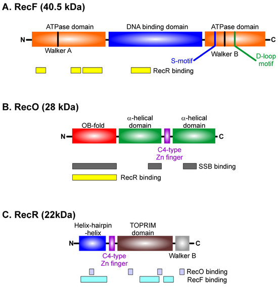 RecF, O, and R protein domain organizations are shared among different bacteria. The schematics for each protein are adapted from [50]. Proteins are presented in order of decreasing size, with the relevant domains color-coded. The regions of each protein responsible for mediating interactions with partners are presented below each schematic. Details are discussed in the text.