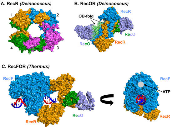 The RecF, O, and R proteins assemble into distinct functional, higher-order structures. Images were generated using Discovery Studio (Biovia). The Connolly surfaces for each protomer are shown [77]. (A) RecR can assemble into a tetramer. The four subunits (each shown in a different color) assemble to form a ring with a central hole sufficiently large to accommodate dsDNA. (B) The RecOR complex is shown from the side. Two subunits of the RecR tetramer are seen in this view with two RecO monomers bound. Each RecO binds to RecR via its N-terminal OB-fold (colored green). The remaining residues of each ReO are colored mauve to facilitate visualization. (C). The RecFOR complex bound to dsDNA is viewed from two angles. Left: the complex is viewed from the side with all protomers of RecF colored blue and RecR colored orange. The N-terminal OB-fold of RecO is colored green, identical to panel (B), and is bound to RecR in proximity to the duplex DNA end. Right: the complex is rotated to enable visualization of the interaction of RecF with the DNA. From this angle, the RecF dimer straddles the duplex DNA, anchoring the complex.