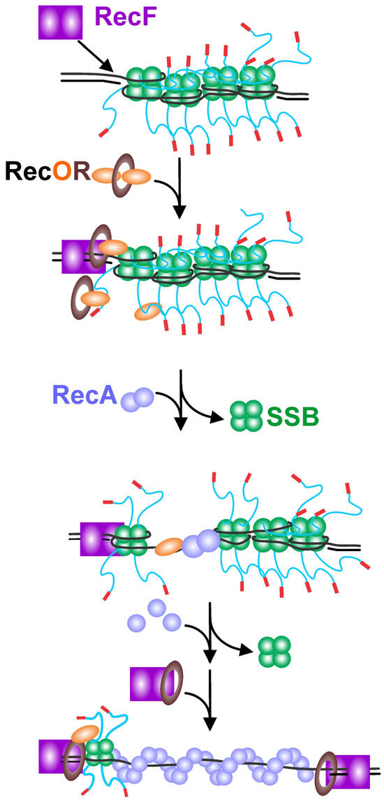 Once RecO is positioned by RecR binding, it can then interact with SSB (Figure 5). This interaction, either via ssDNA binding or direct RecO–SSB interactions, results in either SSB dissociation or SSB sliding to vacate the ssDNA. Regardless, the exposed ssDNA is a substrate for RecA filament nucleation by RecA dimers. Nucleation results in rapid filament extension concomitant with SSB displacement. Once the ssDNA gap is covered by an RecA nucleoprotein filament, binding of RecFR to the 3′-end of the filament and/or distal ss–dsDNA junction occurs. This limits the additional extension of RecA into the undamaged duplex DNA region.