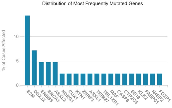 The distribution of the most frequently mutated genes in Acute Myeloid Leukemia (LAML). The bar graph illustrates the percentage of LAML cases affected by mutations in the top mutated genes based on TCGA data. The gene B2M exhibits the highest mutation frequency (>13%), followed by DEAD-box helicase 3 X-linked (DDX3X), human epidermal growth factor receptor 3 (ERBB3), breast cancer gene 1 (BRCA1), and ASXL Transcriptional Regulator 2 (ASXL2), with each affecting 4–8% of cases.