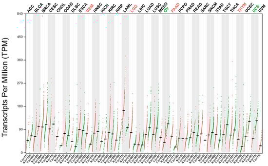 - Tang, Z.; Li, C.; Kang, B.; Gao, G.; Li, C.; Zhang, Z. GEPIA: A web server for cancer and normal gene expression profiling and interactive analyses. Nucleic Acids Res. 2017, 45, W98–W102. [Google Scholar] [CrossRef] [PubMed]