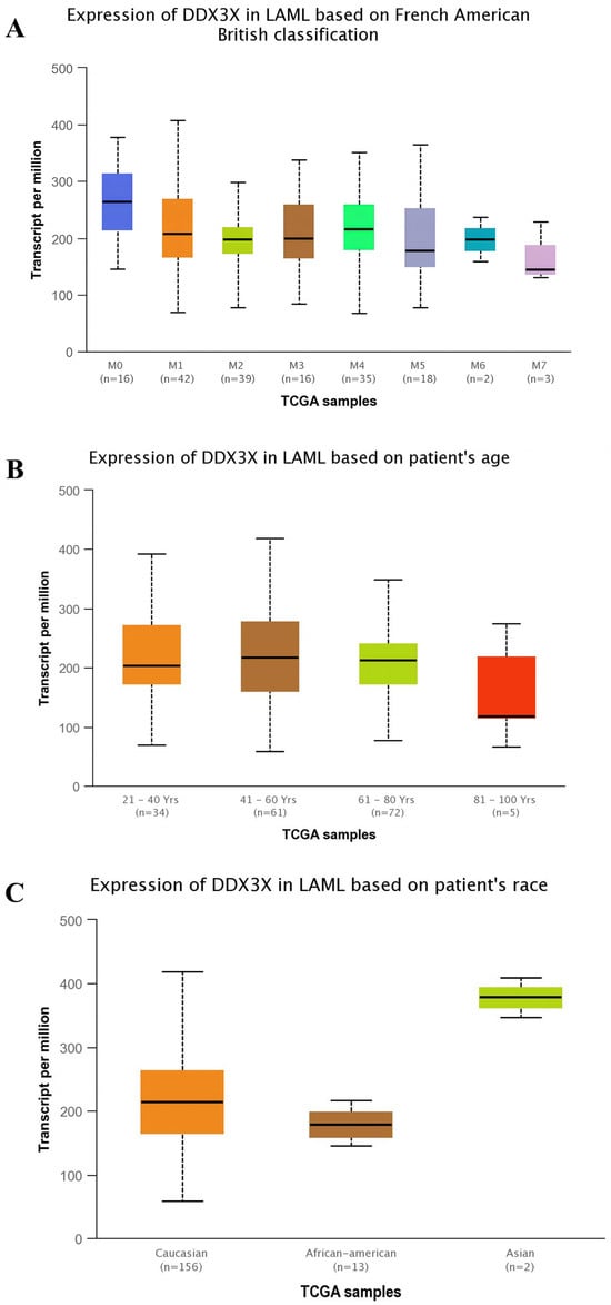 The expression analysis of DDX3X in Acute Myeloid Leukemia (LAML). (A) The DDX3X expression across different LAML subtypes (M0–M7) based on the French–American–British (FAB) classification. (B) The expression in LAML patients grouped by age ranges (21–100 years). (C) The expression among LAML patients from different racial backgrounds. Transcript levels are measured in Transcripts Per Million (TPM). Box plots show the medians, interquartile ranges, and overall distribution.