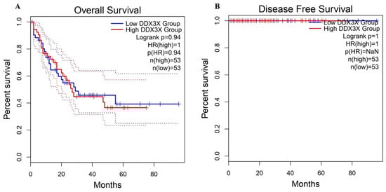 The survival analysis of the DDX3X expression in patients with LAML. (A) The Kaplan–Meier curve for the overall survival (OS) comparing patients with high and low DDX3X expression levels. The p-value of 0.94, with a hazard ratio (HR) of 1.0, indicates no significant difference in the OS between groups. (B) The disease-free survival (DFS) analysis also demonstrated no difference between the high- and low-DDX3X-expression groups.