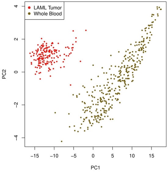 To understand the transcriptomic impact of DDX3X and its associated genes further, we conducted a PCA to distinguish the expression profiles of LAML patients from those of healthy controls. To investigate the global transcriptional impact of DDX3X in LAML, the PCA was performed on genes positively correlated with DDX3X expression. The PCA showed a distinct separation between the LAML tumor samples and the whole blood controls, as shown in Figure 5. While the whole blood controls occupied a clearly separate area along the positive PC1 axis, the LAML samples clustered closely within the negative region of PC1. This significant separation emphasizes the possible involvement of DDX3X-related genes in leukemogenic transformation or disease-specific pathways in LAML by implying considerable transcriptomic variations.