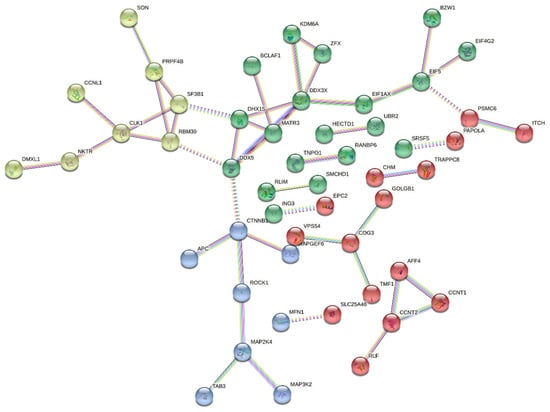 A protein–protein interaction study was conducted using the STRING database to identify the possible molecular interactions and biological activities of DDX3X in LAML. The k-means algorithm grouped the resulting interaction network into three main groups, Cluster 1 (Green nodes), comprising proteins mostly involved in RNA splicing and processing, including DHX15, PRPF4B, and EIF1AX; Cluster 2 (Red nodes), comprising CCNT1, RLF, PAPOLA, and TMF1c, among others, with the proteins in this cluster mostly linked to post-transcriptional modification, RNA polymerase activity, and transcription control; and Cluster 3 (Blue nodes), containing proteins such as CTNNB1, APC, MAP2K4, and TAB3, which are key players in cell signaling, cytoskeletal organization, and apoptosis control, suggesting the possible involvement of DDX3X in signal transduction and cellular homeostasis, as shown in Figure 6.