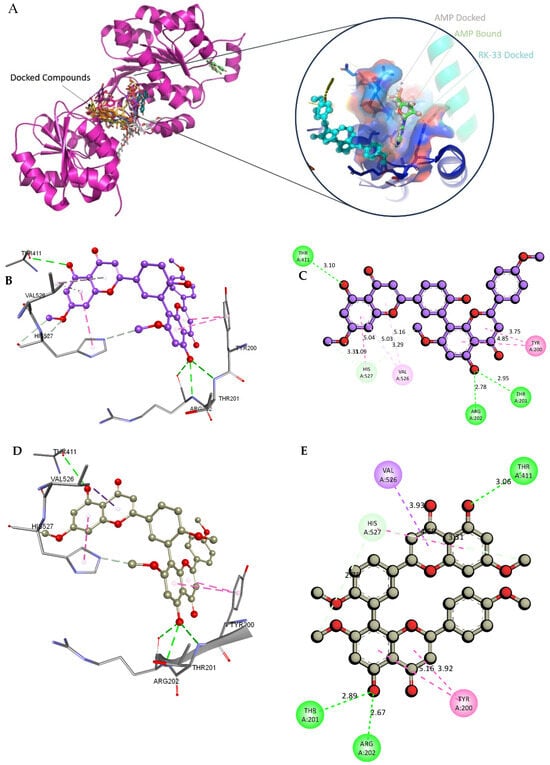 To identify bioavailable and systemically active phytocompounds, we conducted a pharmacokinetic screening of A. javanica-derived molecules in comparison with the reference inhibitor RK-33. The pharmacokinetic profiling of the compounds from A. javanica showed a varied spectrum of absorption, distribution, and metabolism with respect to the control RK-33 (CID: 46184988). Several compounds, such as CID 15559724 and CID 5490003, showed significant P-gp inhibition, moderate BBB penetration, and high HIA values, suggesting their good oral bioavailability and systemic distribution. Their CYP3A4 inhibition potential, however, was lower than that of RK-33, suggesting less drug–drug interaction liability. However, the compounds CID 74978256 and CID 162998749 revealed low HIA and restricted membrane permeability, suggesting their lower absorption potential, as presented in Table 1.