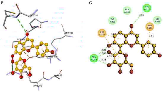 Docking and intra-molecular interactions. (A) All of the superimposed A. javanica compounds (as stick representations) docked into the binding pocket of DDX3X (ODB ID: 2I4I_A) (as cartoon representations), with the top compounds from A. javanica shown in 3D to show the binding surface of the receptor and in 2D representation to show the intra-molecular interactions and their distances in Å. Green dashes represent hydrogen bonds, pink dashes represent hydrophobic interactions, and orange dashes represent electrostatic interactions. Docked compounds: CID 15559724, (B) 3D and (C) 2D; CID 5490003, (D) 3D and (E) 2D; CID 74819331, (F) 3D and (G) 2D.