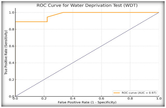 At this cut-off, the WDT demonstrated excellent diagnostic performance, as shown in Table 1, for identifying diabetes insipidus (CDI or NDI). The infinite positive Likelihood Ratio, LR+, was due to 100% specificity, meaning that a positive test result is decisively diagnostic of DI, and the low negative Likelihood Ratio, LR− (0.11), suggests that the WDT is also good at ruling out DI when the test is negative. These results confirm the high diagnostic utility of the WDT in identifying CDI in pediatric patients with polyuria–polydipsia syndrome, albeit with potential limitations in excluding partial or borderline cases.