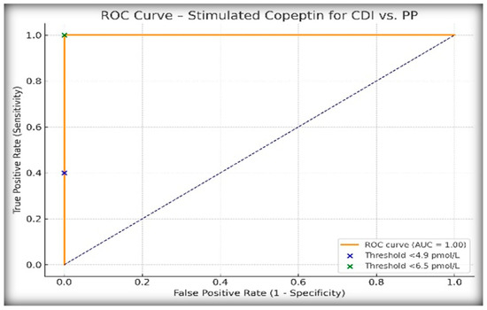 ROC curve analysis (Figure 2) demonstrated an AUC of 1.00, confirming the excellent discriminatory performance of stimulated copeptin for differentiating CDI from PP in our cohort. The positive predictive value (PPV) was 100% at the 6.5 pmol/L threshold, which reflects the complete diagnostic separation observed in our population and further supports the utility of this cut-off in clinical practice.