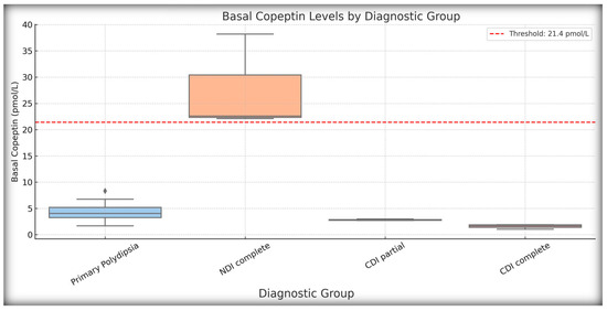 Basal copeptin levels by diagnostic group. Boxplot showing basal (unstimulated) copeptin concentrations across the main diagnostic categories: central diabetes insipidus (complete and partial), nephrogenic diabetes insipidus (NDI complete and partial), and primary polydipsia (PP). Each box represents the interquartile range (IQR), with the median marked by a horizontal line; whiskers extend to the minimum and maximum values, excluding outliers. The dashed red line at 21.4 pmol/L indicates the diagnostic threshold of NDI. All patients with basal copeptin ≥21.4 pmol/L were clinically confirmed as having NDI. Patients with CDI (complete and partial) exhibited uniformly low copeptin levels (<6.5 pmol/L), whereas PP cases showed intermediate values. This pattern supports the diagnostic utility of basal copeptin, particularly for distinguishing NDI from other polyuria–polydipsia etiologies.