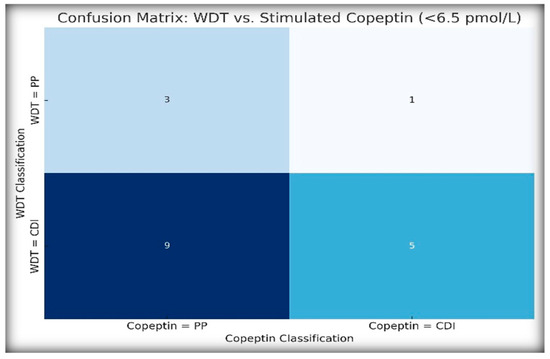 To assess the agreement between traditional and biomarker-based diagnostic strategies, we compared the WDT-based classification (CDI vs. PP) with the stimulated copeptin results using a threshold of <6.5 pmol/L. Figure 5 illustrates diagnostic agreement using a heatmap-style confusion matrix.