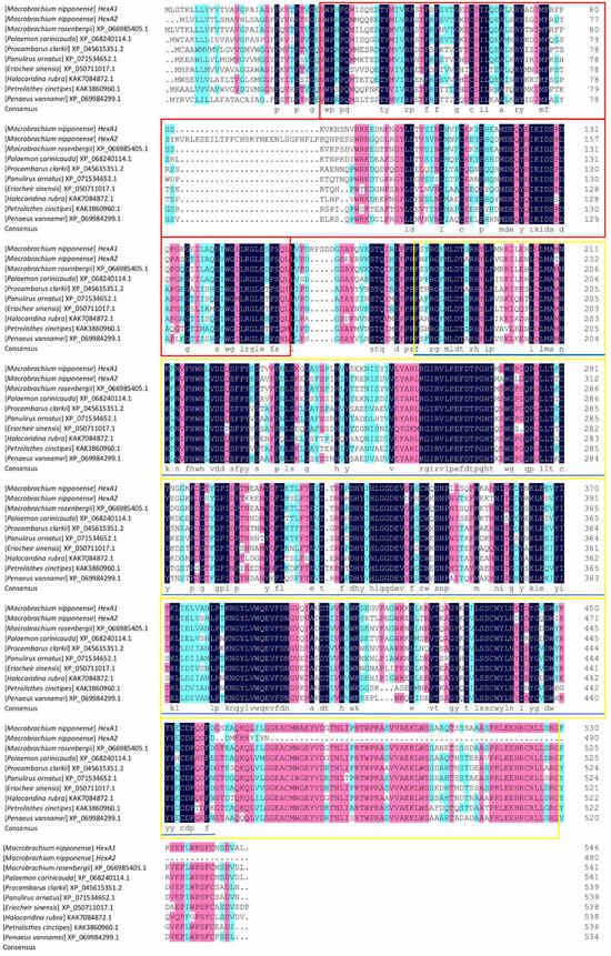 Sequence alignment analysis using DNAMAN 9.0 revealed 58.43% similarity between Mn-HexA1 and Mn-HexA2. Comparative multiple sequence alignment with homologous genes from other species (listed in phylogenetic order: Macrobrachium rosenbergii, Palaemon carinicauda, Procambarus clarkii, Panulirus ornatus, Eriocheir sinensis, Halocaridina rubra, Petrolisthes cinctipes, and Penaeus vannamei) demonstrated that Mn-HexA1 exhibited sequence similarities of 91.76%, 81.17%, 73.57%, 71.56%, 70.56%, 70.45%, 69.26%, and 69.26%, respectively. Correspondingly, Mn-HexA2 showed sequence similarities of 83.40%, 71.40%, 63.68%, 63.71%, 62.84%, 64.02%, 61.29%, and 64.30% with these same species (Figure 1).