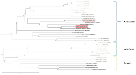 Phylogenetic analysis revealed limited research background for these genes, with homologous sequences from other species in NCBI being predominantly predicted genes. Using MEGA 11.0, we constructed a phylogenetic tree based on the amino acid sequences of Mn-HexA1, Mn-HexA2, and their homologs from other species. The phylogenetic tree demonstrated that Mn-HexA1 and Mn-HexA2 did not cluster with each other initially. Instead, each first grouped with distinct genes from Macrobrachium rosenbergii, then with Palaemon carinicauda from the same family Palaemonidae, before finally clustering together. Subsequently, they collectively branched toward other crustaceans, including Halocaridina rubra, Penaeus vannamei, and Eriocheir sinensis, ultimately converging with Insecta and Arachnida lineages (Figure 2).