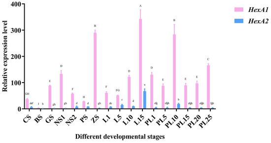 Quantitative analysis of Mn-HexA1 and Mn-HexA2 expression patterns during various developmental stages by qPCR. Data are presented as mean ± SD (n = 6). Extremely significant differential expression was observed between Mn-HexA1 and Mn-HexA2 across all developmental stages (p < 0.01). Uppercase letters indicate statistically significant differences among Mn-HexA1 expression groups (p < 0.05), while lowercase letters denote significant differences among Mn-HexA2 expression groups (p < 0.05). Developmental stages from CS to PL25 are detailed in Table S1.
