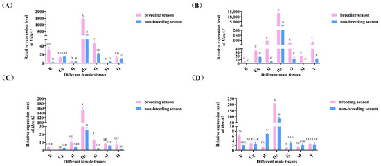 Tissue expression analysis of (A) Mn-HexA1 in females, (B) Mn-HexA1 in males, (C) Mn-HexA2 in females, and (D) Mn-HexA2 in males during breeding season and non-breeding season quantified by qPCR. E: eyestalk; Cg: cerebral ganglion; H: heart; He: hepatopancreas; G: gill; M: muscle; O: ovary; T: testis. Data are presented as mean ± SD (n = 6). Different superscript letters indicate statistically significant differences (p < 0.05).