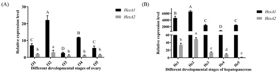 qPCR analysis of Mn-HexA1 and Mn-HexA2 expression patterns during distinct developmental stages in (A) ovarian and (B) hepatopancreatic tissues. Data are presented as mean ± SD (n = 6). Significant differential expression was observed between Mn-HexA1 and Mn-HexA2 across all developmental stages (p < 0.05). Uppercase letters indicate statistically significant differences among Mn-HexA1 expression groups (p < 0.05), whereas lowercase letters denote significant variations among Mn-HexA2 expression groups (p < 0.05). The developmental stages from O1-O5 and He1-He5 are defined in Table S1.