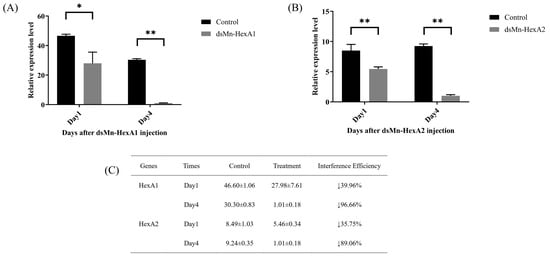 To further investigate the roles of Mn-HexA1 and Mn-HexA2 in ovarian maturation, we performed RNA interference (RNAi) experiments. As demonstrated in Figure 6, the knockdown efficiency for Mn-HexA1 reached 39.96% on day 1 and 96.66% on day 4 post-injection (p < 0.05). Similarly, Mn-HexA2 showed knockdown efficiencies of 35.75% on day 1 and 89.06% on day 4 (p < 0.01), with both genes exhibiting statistically significant silencing effects.