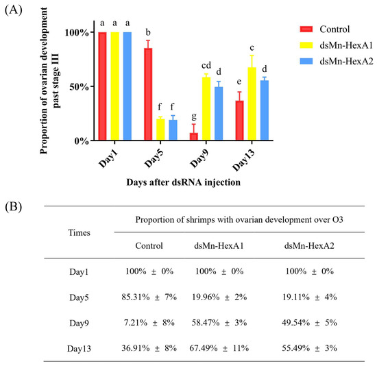 (A) The percentage of female Macrobrachium nipponense ovaries past stage III after injection of dsRNA, with (B) corresponding interference test data. Different letters indicate significant differences. p < 0.05 was considered to be statistically significant.