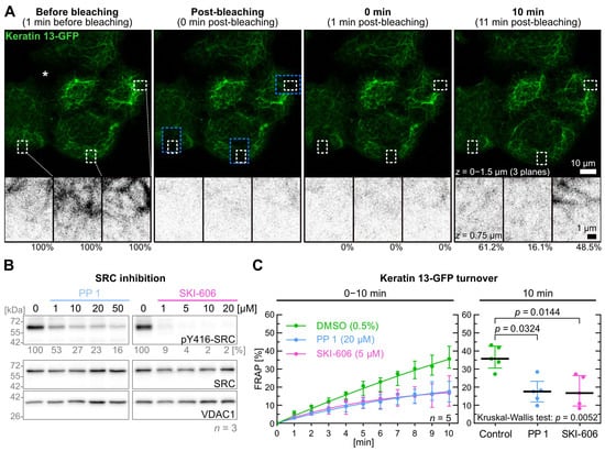 SRC inhibition results in a decrease of keratin filament turnover. Panel (A) presents fluorescence images of the periphery of an A431-derived AK13-1 cell colony. The images were captured during a FRAP experiment in which AK13-1 cells were preincubated for 5–10 min with 0.5% DMSO. The maximum-intensity projections show keratin 13-GFP signals that were compiled from the lower three focal planes before bleaching, immediately after bleaching and at two later time points. The black and white images below are high magnifications of single confocal planes of the regions demarcated by white broken lines that were used for measurements and located within the bleached areas (demarcated by blue broken lines). The measured relative signal intensity values are provided underneath. The asterisk in the top left micrograph is positioned in a region of the colony containing two cells that do not express detectable levels of keratin 13-GFP. (B) shows representative immunoblots of AK13-1 cells treated with two structurally different SRC inhibitors (i.e., PP1 and SKI-606) at increasing concentrations for 5 min. The relative intensity values of the Y416-SRC phosphorylation immunosignals are provided below the top panel (n = 3; percentage of phosphorylated SRC versus VDAC1). (C) shows the time-dependent fluorescence recovery graphs of keratin 13-GFP after bleaching in response to 0.5% DMSO alone (control), 20 µM PP1 and 5 µM SKI-606 after 5–10 min pretreatment (n = 5; 55–58 cells per condition). The FRAP experiments were performed as illustrated in (A). For clarity, the plot at left shows only one median per time point for each condition. The plot on the right presents the fluorescence recovery at the 10-min time point providing the median results of each independent experiment as a dot. Whiskers correspond to interquartile ranges in both diagrams; statistical analysis was performed with a Kruskal–Wallis test at 10 min with a Dunn’s multiple comparisons post-test.
