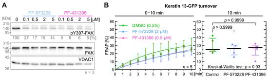 FAK inhibition does not affect keratin filament turnover. (A) shows representative immunoblots of AK13-1 cells treated with two structurally different FAK inhibitors (i.e., PF-573228 and PF-431396) at increasing concentrations for 5 min. The relative intensity values of the Y397-FAK phosphorylation immunosignals are provided below the top panel (n = 3; percentage of phosphorylated FAK versus VDAC1). (B) shows the time-dependent fluorescence recovery graphs of keratin 13-GFP after bleaching in response to 0.5% DMSO (control), 2 µM PF-573228 and 0.5 µM PF-431396 (n = 5; 41–45 cells per condition). The FRAP experiments were performed as illustrated in Figure 1A. The plot on the right presents the fluorescence recovery at the 10-min time point, depicting the median results of each independent experiment as a dot. Whiskers correspond to interquartile ranges in both diagrams; statistical analysis was performed with a Kruskal–Wallis test at 10 min with a Dunn’s multiple comparisons post-test.
