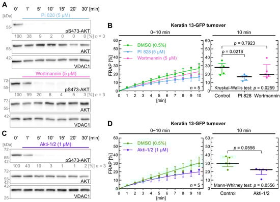 PI3K and AKT inhibition do not significantly affect keratin filament turnover. (A) shows representative immunoblots of AK13-1 cells treated with two structurally different PI3K inhibitors (i.e., 5 µM PI 828 and 5 µM wortmannin) in a time-dependent manner. The relative intensity values of S473-AKT phosphorylation are provided below the top panel (n = 3; percentage of phosphorylated AKT versus VDAC1). In this case we determined PI3K inhibition based on downstream AKT inhibition. (B) shows the time-dependent fluorescence recovery curves of keratin 13-GFP after bleaching in response to 0.5% DMSO (control), 5 µM PI 828 and 5 µM wortmannin (n = 5; 57–59 cells per condition). The FRAP experiments were performed as illustrated in Figure 1A. The plot on the right presents the fluorescence recovery at the 10-min time point depicting the median results of each independent experiment as a dot. Whiskers correspond to interquartile ranges in both diagrams; statistical analysis was performed with a Kruskal–Wallis test at 10 min with a Dunn’s multiple comparisons post-test. (C) shows representative immunoblots of AK13-1 cells treated with the dual AKT1 and AKT2 inhibitor Akti-1/2 (1 µM) in a time-dependent manner. The relative intensity values of phosphorylated S473-AKT are provided below the top panel (n = 3; percentage of phosphorylated AKT versus VDAC1). (D) shows the time-dependent fluorescence recovery curves of keratin 13-GFP after bleaching in response to 0.5% DMSO (control) and 1 µM Akti-1/2 (n = 5; 100–103 cells per condition). Whiskers correspond to interquartile ranges in both diagrams; statistical analysis was performed with a Mann–Whitney test at 10 min.