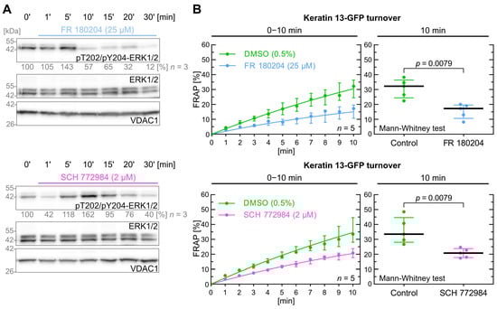 ERK1/2 inhibition decreases keratin turnover. (A) shows representative immunoblots of AK13-1 cells treated with two structurally different PI3K inhibitors (i.e., 25 µM FR 180204 and 2 µM SCH 772984) for different periods. The relative intensity values of phosphorylated T202/Y204-ERK1/2 are provided below the top panel (n = 3; percentage of phosphorylated AKT versus VDAC1). (B) shows the time-dependent fluorescence recovery graphs of keratin 13-GFP after bleaching in response to 0.5% DMSO (control), 25 µM FR 180204 and 2 µM SCH 772984 in two independent sets of experiments (n = 5; 102–105 cells per condition). The FRAP experiments were performed as illustrated in Figure 1A but with an extended 10–15 min drug pretreatment. The plot on the right presents the fluorescence recovery at the 10-min time point depicting the median results of each independent experiment as a dot. Whiskers correspond to interquartile ranges in both diagrams; statistical analysis was performed with a Mann–Whitney test at 10 min.