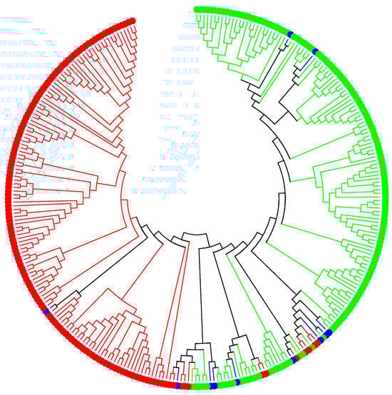 Population structure analysis was conducted using STRUCTURE 2.3.3 (https://web.stanford.edu/group/pritchardlab/structure_software/release_versions/v2.3.3/html/structure.html; Accessed on 12 September 2023). An admixture model and a correlated allele frequency model were used. The burn-in period Markov chain Monte Carlo (MCMC) length was 20,000, and the number of MCMC iterations was set to 20,000. Genetic diversity was established using MEGA 7 (https://www.megasoftware.net/; Accessed on 12 September 2023). The grouping from the population structure analysis was used as an additional parameter to establish genetic diversity. The color coding on the genetic diversity was consistent with the grouping (Q matrix) from the population structure analysis. If an accession was grouped into a class, a color and shape corresponding to that class was designed and used to format the genetic diversity tree. Population structure reduced false positive discovery [,].
