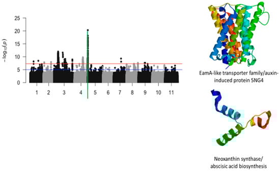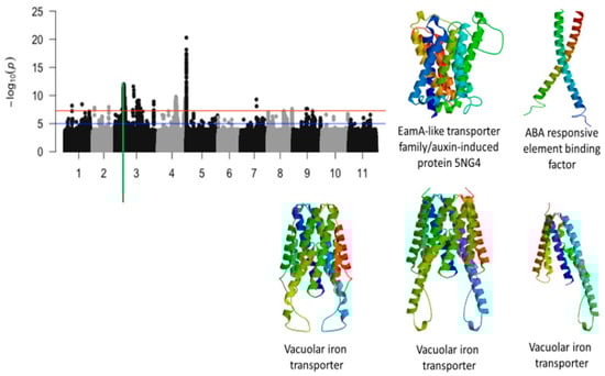 The significant locus found on a 1.3-Mb region of chromosome 3 was defined by a total of 1149 SNPs. Functional annotations of the candidate genes found within regions showed proteins that were involved in hormone-induced responses such as auxin and abscisic acid. This genomic region was also characterized by a significant cluster of biomolecule transporters (Figure 2). Tertiary structure analysis of the proteins that were derived for the candidate genes are shown in Figure 2. For example, a cluster of vacuolar iron transporters were mapped on a 30 kb genomic region and proteins derived from these transporters were slightly different from each other (Figure 2). The SNPs that were found within or in the vicinity of these vacuolar iron transporters were Vu03_13295491, Vu03_13297714, and Vu03_13302250 (Table 1). The candidate genes associated with the vacuolar iron transporters were Vign03g135700.1, Vign03g135800.1, and Vign03g135900.1 (Table 1). The SNP that was found within the annotated gene associated with EamA-like transporter family/auxin-induced protein 5NG4, Vigun03g136600.1, was Vu03_13382599 (LOD = 9.59). In addition, an annotated gene, Vigun03g137500.1, encoding for an ABA responsive element binding was found in the vicinity of Vu03_13509429 (LOD = 10.25). Tolerance to trifoliate leaf chlorosis was assessed based on the level of leaf greenness. As expected, results identified a significant SNP, Vu03_14815803 (LOD = 8.79), that was found on chromosome 3 and located within an annotated gene encoding for a chlorophyll a/b binding protein. In addition, a significant SNP, Vu03_36340055, was also mapped in the vicinity of an annotated gene encoding for ABC-2 type transporter family protein (Table 1). Other genomic regions of chromosome 3 also harbored significant SNPs associated with tolerance to trifoliate leaf chlorosis under drought stress in cowpea. However, these regions were less gene-dense, and the annotated genes found within these regions had functional annotations that were less relevant to plant abiotic stress.