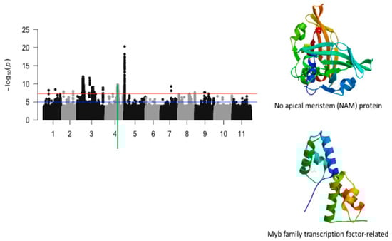 Chromosome 4 had two significant loci defined by about 800 kb and 100 bk genomic regions, respectively (Figure 3). The 800 bk genomic region harbored a total of 484 significant SNPs and the second one had 69 SNPs. Of these SNPs, 19 were mapped within the structure of annotated genes that had functional annotations relevant to plant abiotic stress. These SNPs consisted of Vu04_26966450 (LOD = 8.37), Vu04_27157237 (LOD = 8.21), Vu04_27241963 (LOD = 8.3), Vu04_27298716 (LOD = 8.22), Vu04_27342140 (LOD = 8.56), Vu04_27505387 (LOD = 8.51), Vu04_27528973 (LOD = 8.1), Vu04_27714135 (LOD = 8.72), Vu04_27716250 (LOD = 8.35), Vu04_27778870 (LOD = 7.67), Vu04_27786623 (LOD = 9.08), Vu04_27797389 (LOD = 8.37), Vu04_27830859 (LOD = 7.81), Vu04_27913211 (LOD = 7.8), Vu04_27913980 (LOD = 8.06), Vu04_41785910 (LOD = 8.5), Vu04_41800041 (LOD = 7.67), Vu04_41826262 (LOD = 8.11), and Vu04_41832927 (LOD = 8.09) (Table 1). Two annotated genes, Vigun04g110600.1 and Vigun04g110800.1, having functional annotations that were directly relevant were found within the 800 kb locus associated with tolerance trifoliate leaf chlorosis. Vigun04g110600.1 and Vigun04g110800 encodes for no apical meristem protein (NAM) and a Myb-family protein. Structural analysis of these two proteins was investigated and is visualized in Figure 3.