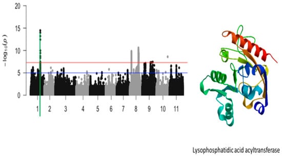 The significant locus that was identified on chromosome 1 was defined by a total of 8 SNPs. These SNPs were mapped on a 27 kb region of chromosome 1 (Figure 5). These SNPs were Vu01_29542433 (LOD = 9.98), Vu01_29544073 (LOD = 13.2), Vu01_29544191 (LOD = 14.45), Vu01_29544749 (LOD = 13.97), Vu01_29548480 (LOD = 12.43), Vu01_29549609 (LOD = 8.33), Vu01_29558145 (LOD = 8.72), and Vu01_29570238 (LOD = 9.43) (Table 1). A total of three annotated genes were found within this region. Of the three annotated genes, Vigun01g119000.1 is the only one that has a functional annotation. Vigun01g119000.1 encodes for lysophosphatidic acid acyltransferase (Figure 5). The significant SNP that was closest to this annotated gene was Vu01_29544191 (LOD = 14.45).