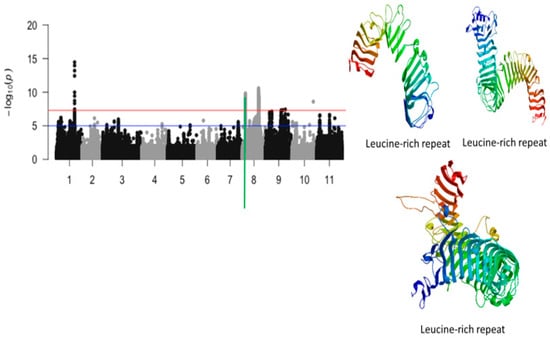 A 42 kb region of chromosome 8 contained a total of 65 SNPs that were significantly associated with tolerance to unifoliate leaf chlorosis under drought stress in cowpea (Figure 6). Of these SNPs, those with the highest LOD values were Vu08_4952393 (LOD = 9.83), Vu08_4946612 (LOD = 9.70), Vu08_4946618 (LOD = 9.70), Vu08_4945615 (LOD = 9.67), Vu08_4945627 (LOD = 9.61), Vu08_4946651 (LOD = 9.58), Vu08_4951347 (LOD = 9.51), Vu08_4951349 (LOD = 9.51), Vu08_4936939 (LOD = 9.40), Vu08_4946653 (LOD = 9.39), Vu08_4946682 (LOD = 9.39), Vu08_4946699 (LOD = 9.34), Vu08_4952509 (LOD = 9.34), Vu08_4952522 (LOD = 9.34), and Vu08_4952526 (LOD = 9.34). The significant locus defined by the 42 kb region of chromosome 8 harbored a cluster of three annotated genes encoding for a leucine-rich repeat (Table 1). The SNPs that were in the vicinity or within the structure of these annotated genes were Vu08_4931701 (LOD = 8.32), Vu08_4945627 (LOD = 9.61), and Vu08_4952526 (LOD = 10.59). The predicted tertiary structure of the protein derived from the three annotated genes was slightly different (Figure 6).