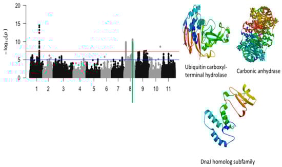 The third significant locus associated with tolerance to unifoliate leaf chlorosis was mapped on a 184 kb region of chromosome 8 (Figure 7). This region harbored a total of 517 significant SNPs. LOD (−log10(p-value)) values of the significant SNPs found in this region varied from 7.52 to 10.59. The SNPs with the highest LOD values were Vu08_26752606 (LOD = 10.59), Vu08_26852413 (LOD = 10.31), Vu08_26874709 (LOD = 10.27), Vu08_26898363 (LOD = 10.17), Vu08_26888097 (LOD = 10.11), Vu08_26877485 (LOD = 10.08), Vu08_26901689 (LOD = 10.04), Vu08_26878780 (LOD = 9.87), Vu08_26871649 (LOD = 9.83), Vu08_26871652 (LOD = 9.83), Vu08_26877438 (LOD = 9.78), Vu08_26874835 (LOD = 9.77), Vu08_26897604 (LOD = 9.77), and Vu08_26883655 (LOD = 9.75). The significant locus defined by the 184 kb region of chromosome 8 harbored seven annotated genes with six having functional annotations. The SNPs Vu08_26752606 (LOD = 10.59), Vu08_26868733 (LOD = 8.83), Vu08_26877485 (LOD = 10.08), and Vu08_26901689 (LOD = 10.04) were found in the vicinity or within the structure of Vigun08g107800.1, Vigun08g107900.1, Vigun08g108100.1, and Vigun08g108400.1 encoding for Ubiquitin carboxyl-terminal hydrolase, AT-hook DNA-binding family protein, carbonic anhydrase, and DnaJ homolog subfamily, respectively. The predicted tertiary structure of these proteins is shown in Figure 7. One significant SNP located on chromosome 10 was also found to be associated with tolerance to unifoliate leaf chlorosis under drought stress in cowpea (Figure 8).