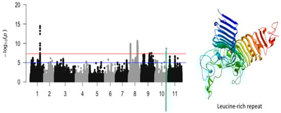 Manhattan plot for tolerance to unifoliate leaf chlorosis under drought in cowpea where the vertical green line defines a genomic region harboring candidate genes encoding for leucine-rich repeats.