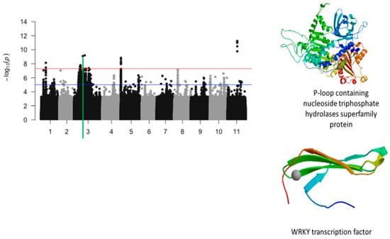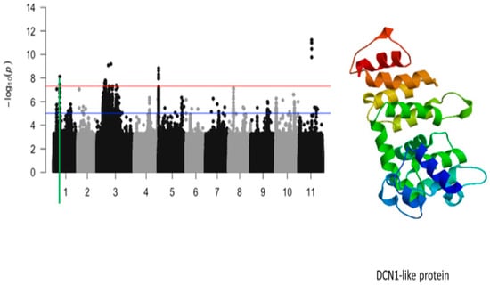The significant SNPs associated with plant greenness score under drought stress consisted of Vu01_10616486 (LOD = 8.13), Vu03_13509429 (LOD = 7.58), Vu03_14725410 (LOD = 7.56), Vu03_14725434 (LOD = 7.78), Vu03_14725437 (LOD = 7.78), Vu03_14725438 (LOD = 7.78), Vu03_14725450 (LOD = 7.69), Vu03_14730296 (LOD = 7.59), Vu03_14730297 (LOD = 7.59), Vu03_14735109 (LOD = 7.58), Vu03_15042787 (LOD = 7.73), Vu03_20084616 (LOD = 9.09), Vu03_24643282 (LOD = 9.19), Vu05_540561 (LOD = 8.32), Vu05_541044 (LOD = 8.62), Vu05_541198 (LOD = 8.84), Vu05_541677 (LOD = 7.95), Vu05_544287 (LOD = 8.12), Vu11_22285237 (LOD = 11.00), Vu11_22285238 (LOD = 11.00), Vu11_22285251 (LOD = 11.00), Vu11_22285317 (LOD = 11.24), Vu11_22285318 (LOD = 11.24), Vu11_22285324 (LOD = 9.77), and Vu11_22285327 (LOD = 10.48). On chromosome 1, the SNP that was located in the vicinity of an annotated gene, Vigun01g054900.1, was Vu01_10616486 (LOD = 8.13). This gene encodes for DCN1-like protein. The predicted tertiary structure of this protein is shown in Figure 8. The genomic region harboring Vu01_10616486 contained also SNPs with relatively high LOD (−log10(p-value)) values as shown in Figure 9. However, these SNPs were just below the threshold that was chosen to declare significance in this study. The SNPs Vu03_13509429 (LOD = 7.58) and Vu03_14725438 (LOD = 7.78) were very close to the annotated genes Vigun03g137600.1 and Vigun03g144800.1, respectively. The functional annotations of the proteins derived from these genes were the P-loop containing nucleoside triphosphate hydrolase superfamily protein and WRKY transcription factor, respectively. The predicted tertiary structure of these proteins is shown in Figure 10. Interestingly, the significant locus found at the beginning of chromosome 5 overlapped with the locus associated with tolerance to first trifoliate leaf chlorosis under drought stress (Figure 11). One significant SNP associated with plant greenness score and mapped on chromosome 5 was just located at 1 kb of another SNP having the highest LOD value for tolerance to trifoliate leaf chlorosis. These results indicate that this genomic result could control both the plant greenness score and tolerance to trifoliate leaf chlorosis under drought stress in cowpea. No annotated genes were found in the vicinity of the significant SNPs that were mapped on chromosome 11.