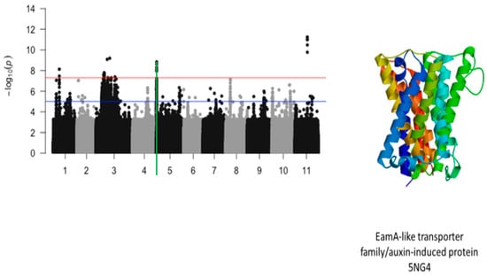 Manhattan plot for plant greenness score under drought stress in cowpea where the vertical green line defines a genomic region harboring a gene encoding for EamA-like transporter family/auxin-induced protein 5NG4.