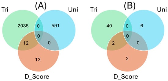(A) Venn diagram showing the number of overlapping significant SNPs associated with tolerance to trifoliate leaf chlorosis (Tri), unifoliate leaf chlorosis (Uni), and plant greenness score (D_Score) under drought stress in cowpea. (B) Venn diagram showing the number of unique functional annotations for candidate genes associated with tolerance to trifoliate leaf chlorosis (Tri), unifoliate leaf chlorosis (Uni), and plant greenness score (D_Score) under drought stress in cowpea. Venn diagrams were established using http://jvenn.toulouse.inra.fr/app/example.html (Accessed on 12 September 2023).