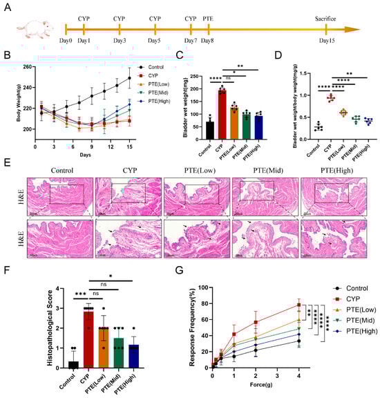 2.1. Treatment with PTE Decreases Bladder Pain and the Inflammation of Bladder in CYP-Induced IC in Rats