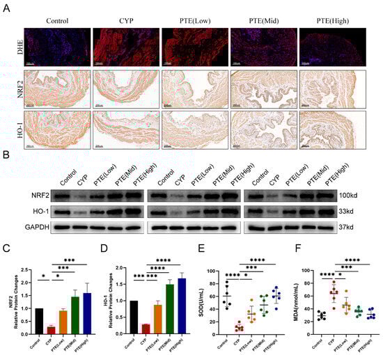 2.3. PTE Activates the Nrf2/HO-1 Pathway and Alleviates Oxidative Stress in CYP-Induced Rats
