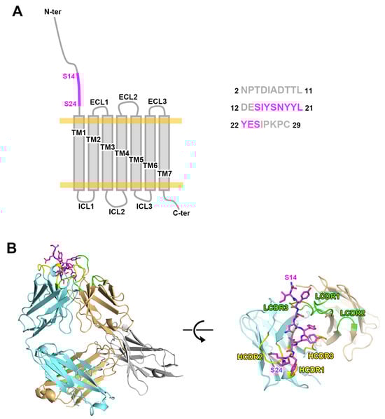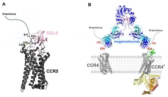 Despite the absence of the structure of CCR4 or its complexes with binding partners, including ligands or antibodies, the complete architecture of the mogamulizumab-binding CCR4 can be hypothesized from the structures of other homologous class A GPCRs, including CCR1, CCR2, CCR3, CCR5, CCR6, CCR8, and CCR9 [23,24,25,26,27,28]. In class A GPCRs, the cysteine residue at position 29 of CCR4 is fully conserved and located at the membrane surface, linked by a disulfide bond to another cysteine residue in a transmembrane helix of GPCRs. The human C-C chemokine receptor 5 (CCR5) exhibits 50% identity in its amino acid sequence with CCR4, and its molecular structures for ligand recognition and activation are well characterized. CCR5 also has a long N-terminal region, as does CCR4, with the residue C20 making a disulfide bond to C269 [25]. In its active form complexed with its ligand CCL5, only the two residues adjacent to C20, P19 and E18 are involved in the interaction with the ligand. In contrast, the prior N-terminal residues (residues 1–17) have been missing from the structure, suggesting their non-involvement in ligand binding (Figure 5A). The mogamulizumab epitope (residues 15–24) is positioned four residues away from the conserved cysteine, C29 of CCR4, and an AlphaFold3-predicted model demonstrates that the N-terminal region of CCR4 does not participate in ligand binding except that P28 of CCR4 interacts with CCL17 through van der Waals contacts (Supplementary Figure S4) [29]. This suggests that mogamulizumab binding does not interfere with ligand binding to CCR4. Therefore, mogamulizumab can bind to the membrane-proximal epitope in CCR4, regardless of whether it is in its inactive free form or its active form with a bound ligand for intracellular signaling (Figure 5B). Mogamulizumab’s binding is not contingent upon the presence of the ligand bound to CCR4, perhaps resulting in a more enhanced ADCC through binding to both types of CCR4, unlike antibodies that target only one type.