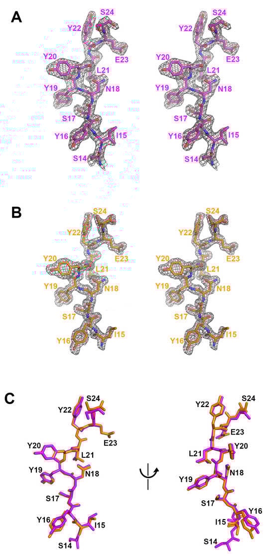 The comparison of the bound peptides. (A) The residues 14 to 24 of the 28-residue peptide within the ternary complex structure. A stereoscopic view of 2fofc electron density map calculated at 2.01 Å resolution and 1.2 σ contour level. (B) The residues 15 to 24 of the 11-residue peptide within the binary complex structure. A stereoscopic view of 2fofc electron density map calculated at 1.63 Å resolution and 1.2 σ contour level. (C) The superposition of the peptide residues within the ternary (purple) and binary (orange) complex structures.