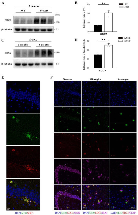 To further elucidate the cellular origins of SDC3 co-deposition with Aβ, we performed co-immunostaining with specific markers for neurons, microglia, and astrocytes. These results showed that SDC3 was predominantly localized in glial cells, with a marked upregulation in their expression (Figure 1F).