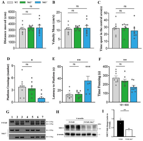 Sdc3−/− mice display cognitive deficits, while Sdc3+/− mice remain unaffected. (A–C) Total distance traveled (A), movement speed (B), and time spent in the central area (C) in the open field test for WT mice, Sdc3−/− mice, and Sdc3+/− mice. (D) Platform cross number in the MWM probe test. (E) Time to platform in the MWM probe test. (F) Freezing time in contextual FC tests as a readout of associative memory. Each dot represents an individual mouse: mice in each group (n = 8, mixed sexes). Data are analyzed by two-sided unpaired t-test. (G) Identification of mouse tail genomic DNA (the target gene Sdc3+/− fragments are 426 bp and 370bp, and the 5×FAD fragments are 216 bp and 129bp). (H,I) Immunoblotting analysis (H) and quantification (I) of the expression of SDC3 and β-tubulin (as a loading control) in the hippocampus regions of 6-month-old 5×FAD and 5×FAD; Sdc3+/− mice (n = 3 mice in each group; SDC3: two-sided unpaired t-test). Differences among multiple groups were assessed using one-way ANOVA, followed by post hoc tests such as Tukey’s or Games–Howell’s tests. Each circle represents one mouse. Data are presented as mean ± S.E.M. Significance levels are indicated as follows: * p < 0.05; ** p < 0.01; ns: not significant.