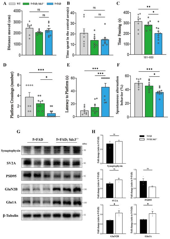 Downregulation of SDC3 ameliorates cognitive impairment in 5×FAD mice. (A,B) Total distance traveled (A) and time spent in the central area (B) in the open field test for WT mice, 5×FAD mice and 5×FAD; Sdc3+/− mice. (C) Freezing time in contextual FC tests as a readout of associative memory. (D) Platform cross number in the MWM probe test. (E) Time to platform in the MWM probe test. (F) Percentage of spontaneous alterations in the Y maze test. Each dot represents an individual mouse: mice in each group (n = 8–10, mixed sexes). Data are analyzed by two-sided unpaired t-test. (G,H) Immunoblotting analysis (G), and quantification (H) of the expression of Synaptophysin, SV2A, PSD95, Glu1A, GluN2B, and β-tubulin (as a loading control) in the hippocampus regions of 6-month-old 5×FAD and 5×FAD; Sdc3+/− mice (n = 3 mice in each group; two-sided unpaired t-test). Differences among multiple groups were assessed using one-way ANOVA, followed by post hoc tests such as Tukey’s or Games–Howell’s tests. Each circle represents one mouse. Data are presented as mean ± S.E.M. Significance levels are indicated as follows: * p < 0.05; ** p < 0.01; *** p < 0.001; ns: not significant.