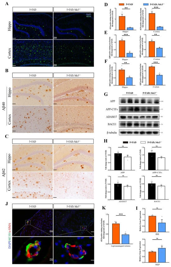 Given that several types of HSPGs have been demonstrated to be expressed by cells within the cerebrovascular system and implicated in the pathogenesis of cerebral amyloid angiopathy (CAA) [34,35,36], we performed co-staining of the vascular smooth muscle cell marker α-smooth muscle actin (α-SMA) with Aβ (6E10). The results revealed a significant reduction in Aβ deposition within the leptomeningeal arterial walls of 5×FAD; Sdc3+/− mice (Figure 4J,K). This suggests that downregulation of SDC3 may lower the risk of CAA.